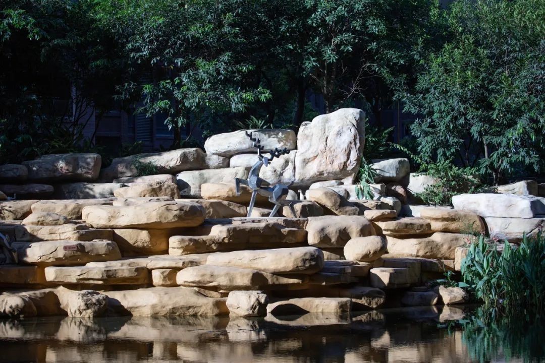 項(xiàng)目尊重城市肌理的同時,通過采集自然的靈魂?duì)I造出獨(dú)特的生態(tài)脈絡(luò)。采用光際穿梭的直線、云團(tuán)投影的弧形、河流流動的曲線、梯田植被的層次以及栩栩如生的動物造型作為景觀建造布局的設(shè)計元素,形態(tài)各異的長角鹿造型作為主要元素布置在牧云溪谷的山水漫野間,猶如畫龍點(diǎn)睛,為空靈的生態(tài)園林增添勃勃生機(jī)。
